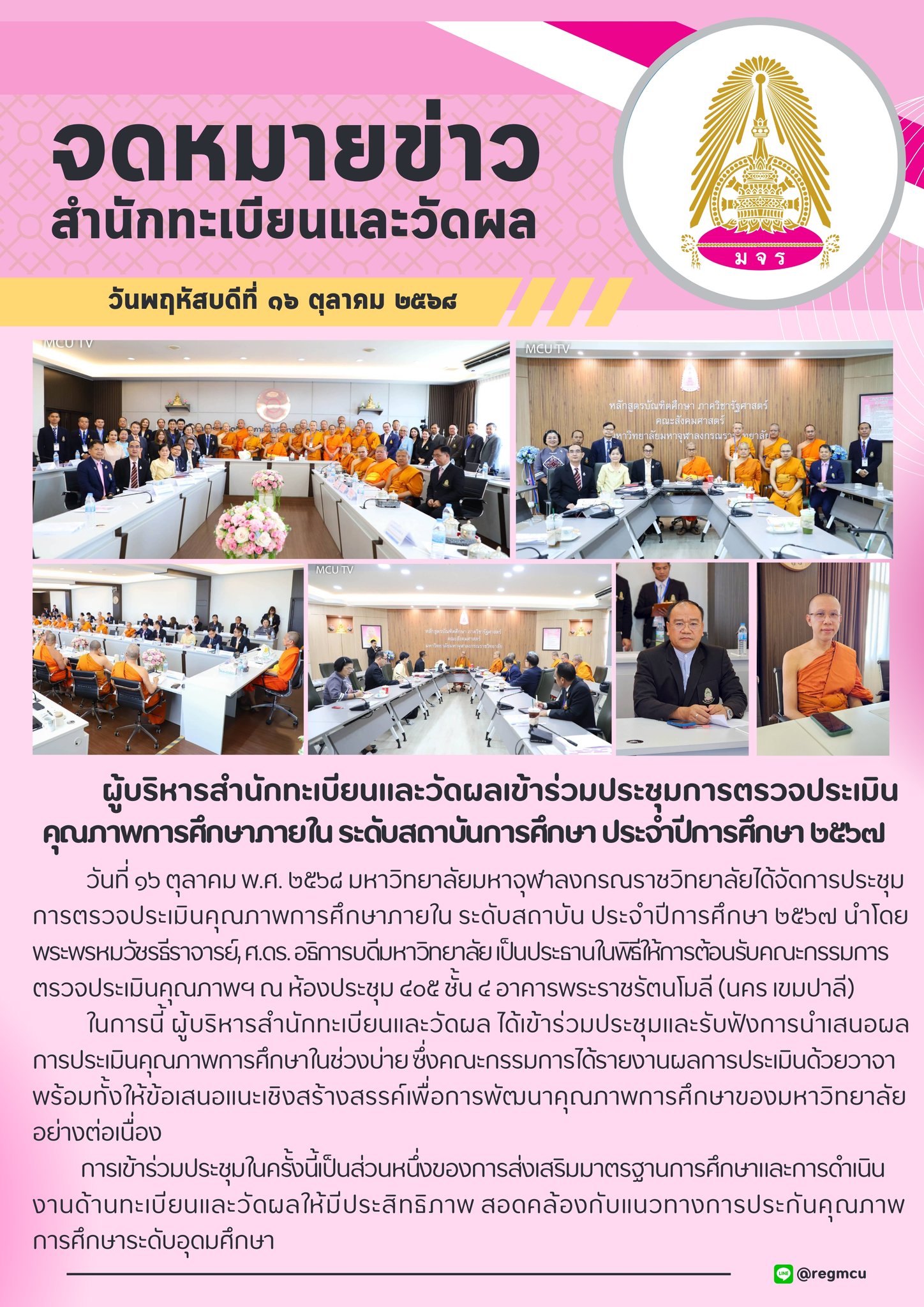 ผู้บริหารสำนักทะเบียนและวัดผลเข้าร่วมประชุมการตรวจประเมินคุณภาพการศึกษาภายใน ระดับสถาบันการศึกษา ประจำปีการศึกษา ๒๕๖๗