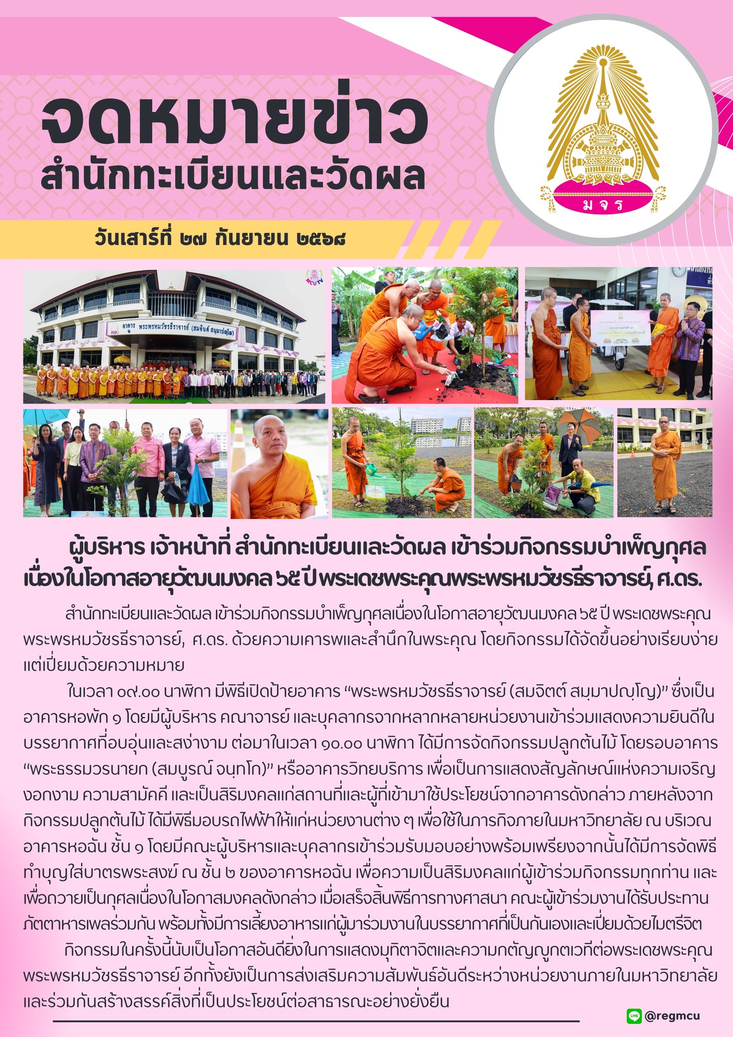 ผู้บริหาร เจ้าหน้าที่ สำนักทะเบียนและวัดผล เข้าร่วมกิจกรรมบำเพ็ญกุศล เนื่องในโอกาสอายุวัฒนมงคล ๖๕ ปี พระเดชพระคุณพระพรหมวัชรธีราจารย์, ศ.ดร.