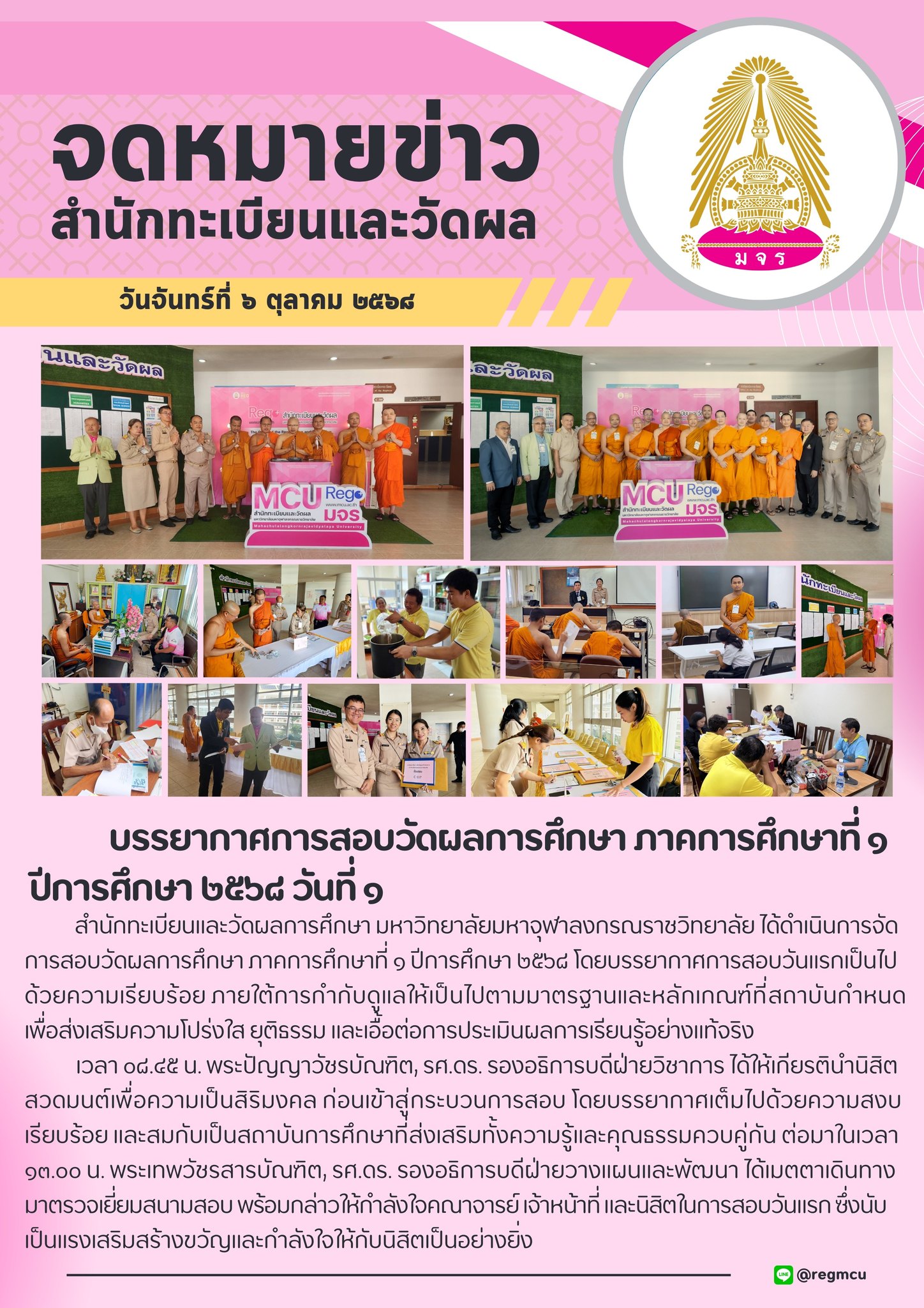 สำนักทะเบียนและวัดผลการศึกษา มหาวิทยาลัยมหาจุฬาลงกรณราชวิทยาลัย ได้ดำเนินการจัด การสอบวัดผลการศึกษา ภาคการศึกษาที่ ๑ ปีการศึกษา ๒๕๖๘ โดยบรรยากาศการสอบวันแรกเป็นไปด้วยความเรียบร้อย ภายใต้การกำกับดูแลให้เป็นไปตามมาตรฐานและหลักเกณฑ์ที่สถาบันกำหนด เพื่อส่งเสริมความโปร่งใส ยุติธรรม และเอื้อต่อการประเมินผลการเรียนรู้อย่างแท้จริง