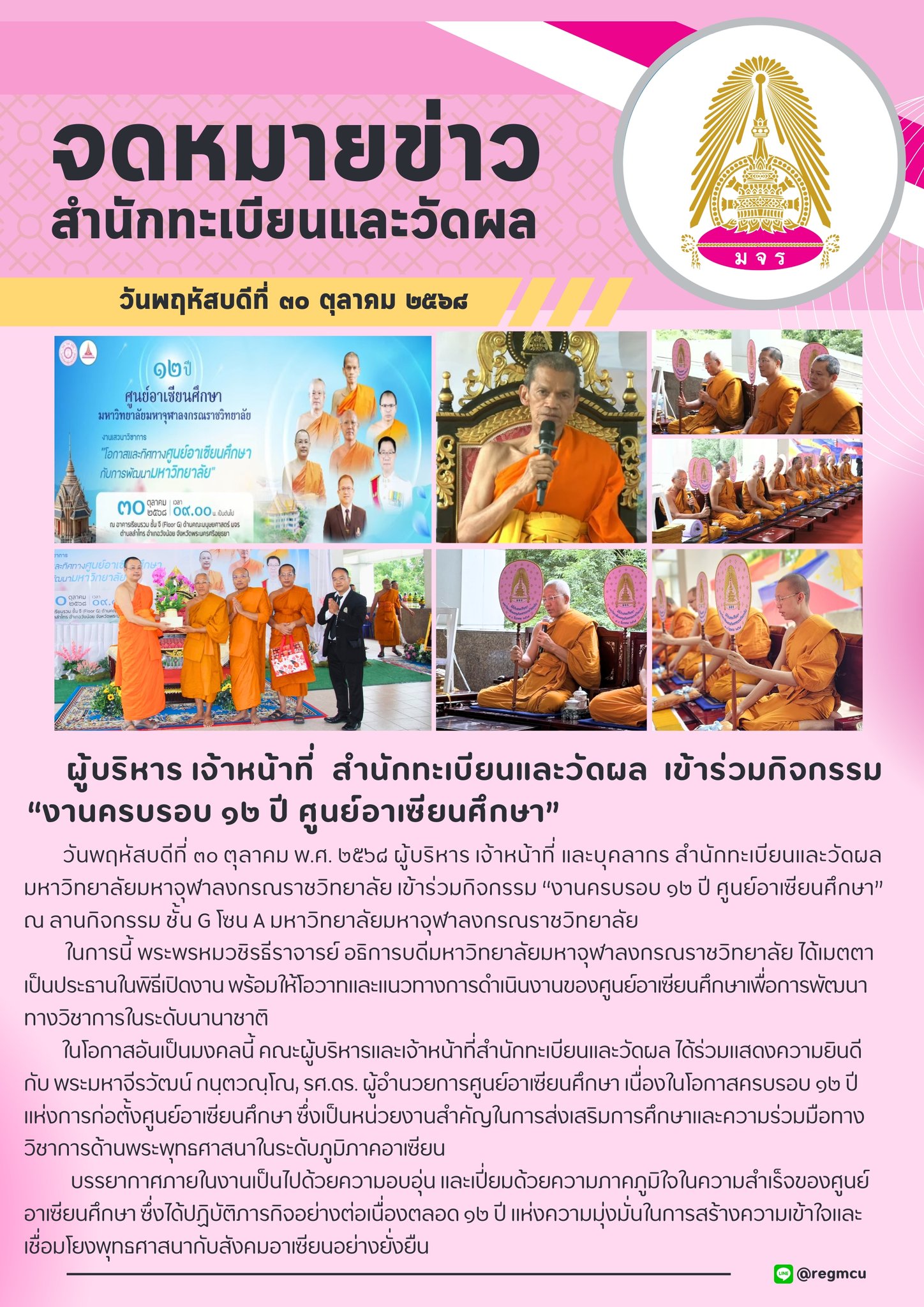 วันพฤหัสบดีที่ ๓๐ ตุลาคม พ.ศ. ๒๕๖๘ คณะผู้บริหารและเจ้าหน้าที่ของ สำนักทะเบียนและวัดผล มหาวิทยาลัยมหาจุฬาลงกรณราชวิทยาลัย (มจร) ได้เข้าร่วมกิจกรรมสำคัญ “งานครบรอบ ๑๒ ปี ศูนย์อาเซียนศึกษา” ซึ่งจัดขึ้นอย่างอบอุ่นและสมเกียรติ ณ ลานกิจกรรม ชั้น G โซน A มหาวิทยาลัยมหาจุฬาลงกรณราชวิทยาลัย