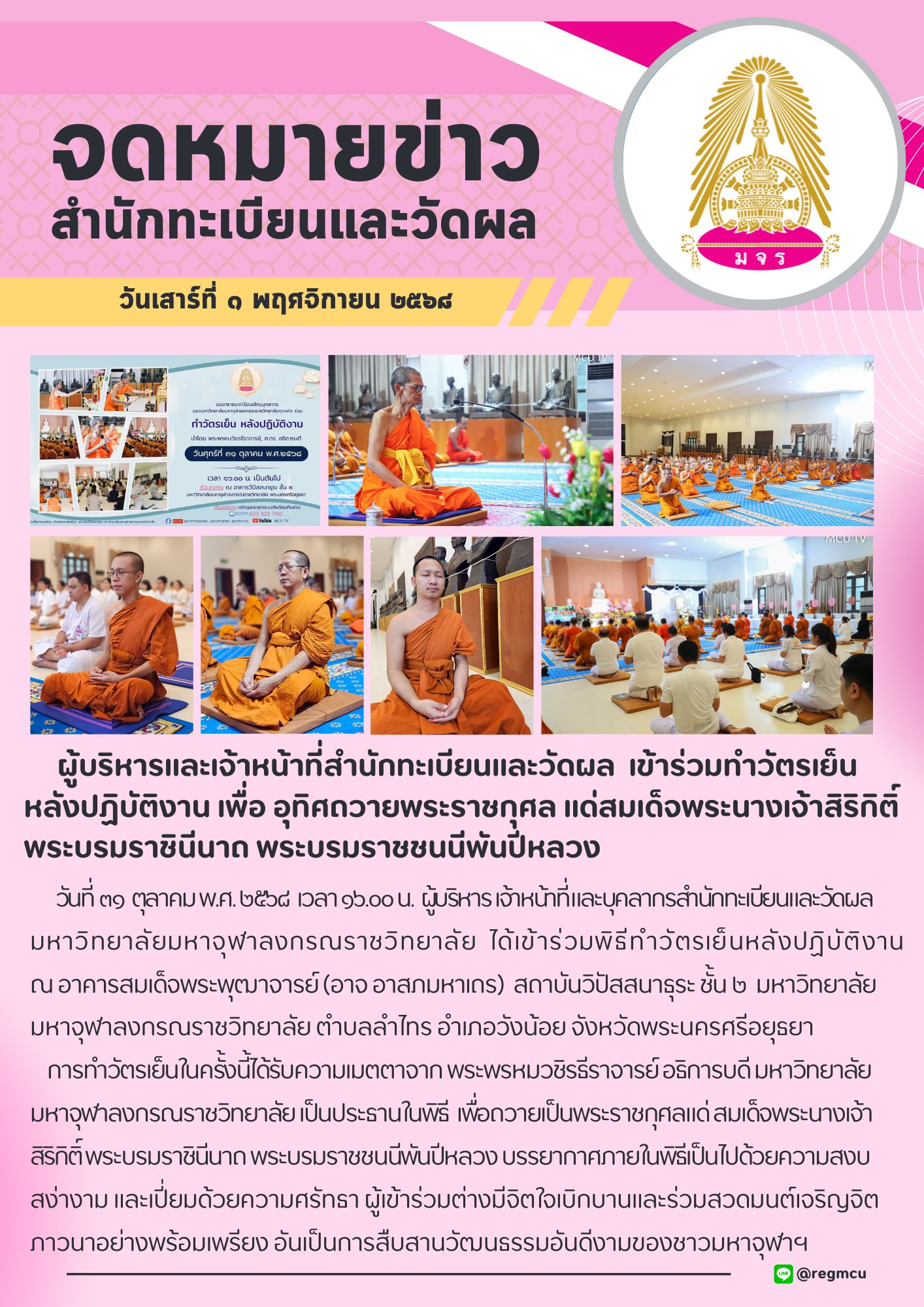 เมื่อวันที่ ๓๑ ตุลาคม พ.ศ. ๒๕๖๘ เวลา ๑๖.๐๐ น. คณะผู้บริหาร เจ้าหน้าที่ และบุคลากร สำนักทะเบียนและวัดผล มหาวิทยาลัยมหาจุฬาลงกรณราชวิทยาลัย (มจร) ได้ร่วมกันประกอบ พิธีทำวัตรเย็นหลังปฏิบัติงาน ณ อาคารสมเด็จพระพุฒาจารย์ (อาจ อาสภมหาเถร) สถาบันวิปัสสนาธุระ ชั้น ๒ มหาวิทยาลัยมหาจุฬาลงกรณราชวิทยาลัย ตำบลลำไทร อำเภอวังน้อย จังหวัดพระนครศรีอยุธยา