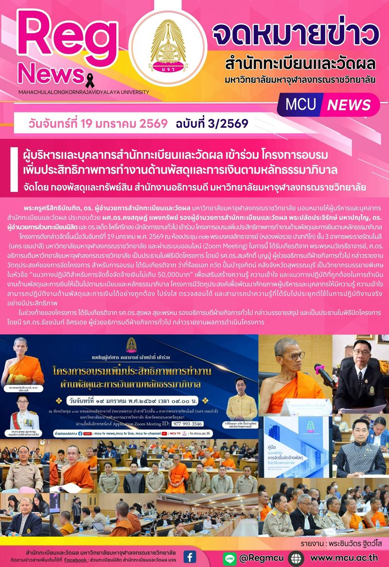 เมื่อวันจันทร์ที่ ๑๙ มกราคม พุทธศักราช ๒๕๖๙ มหาวิทยาลัยมหาจุฬาลงกรณราชวิทยาลัย (มจร) โดยกองพัสดุและทรัพย์สิน สำนักงานอธิการบดี ได้จัดโครงการอบรม “เพิ่มประสิทธิภาพการทำงานด้านพัสดุและการเงินตามหลักธรรมาภิบาล” ณ ห้องประชุม ๓๐๒ พระมงคลสิทธาจารย์ ชั้น ๓ อาคารพระราชรัตนโมลี และผ่านระบบออนไลน์ Zoom Meeting