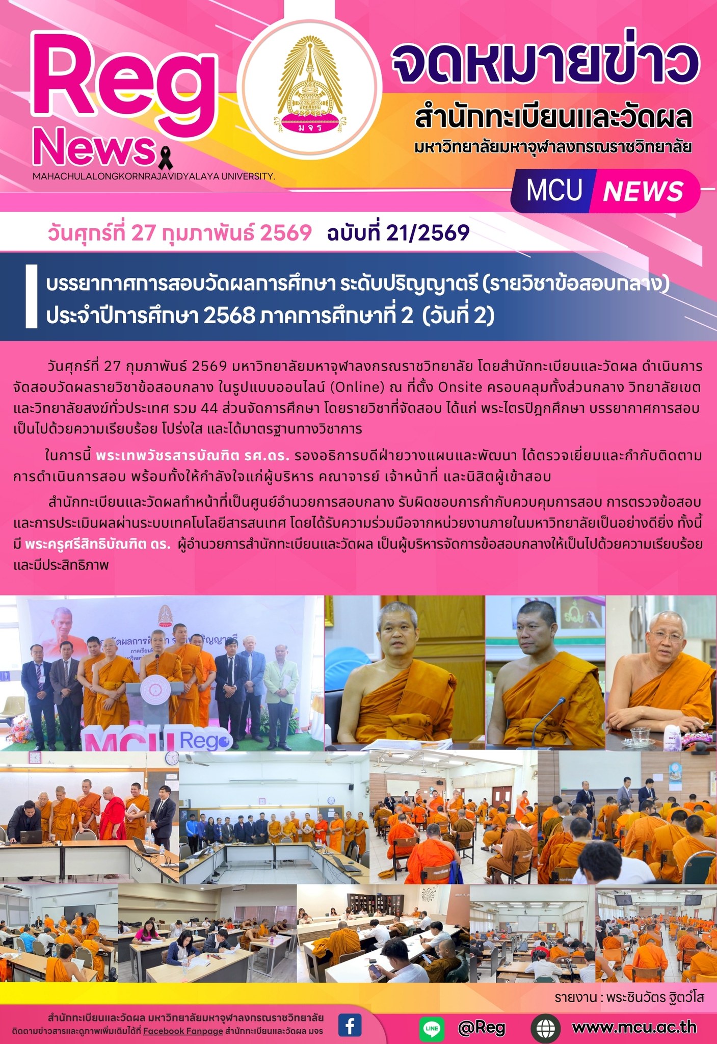 มหาวิทยาลัยมหาจุฬาลงกรณราชวิทยาลัย โดยสำนักทะเบียนและวัดผล ดำเนินการจัดสอบวัดผลรายวิชาข้อสอบกลาง ในรูปแบบออนไลน์ (Online) 💻 ณ ที่ตั้ง Onsite ครอบคลุมทั้งส่วนกลาง วิทยาลัยเขต และวิทยาลัยสงฆ์ทั่วประเทศ รวมทั้งสิ้น 44 ส่วนจัดการศึกษา