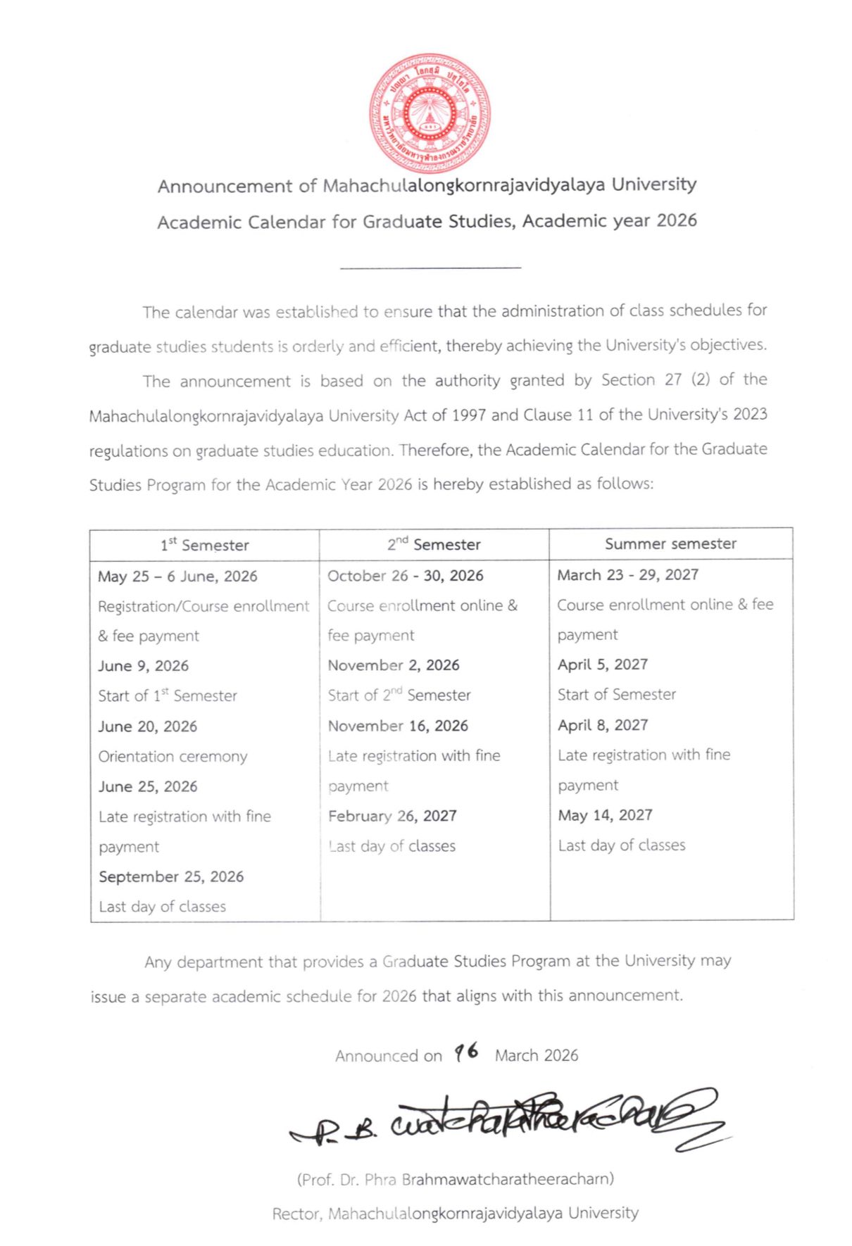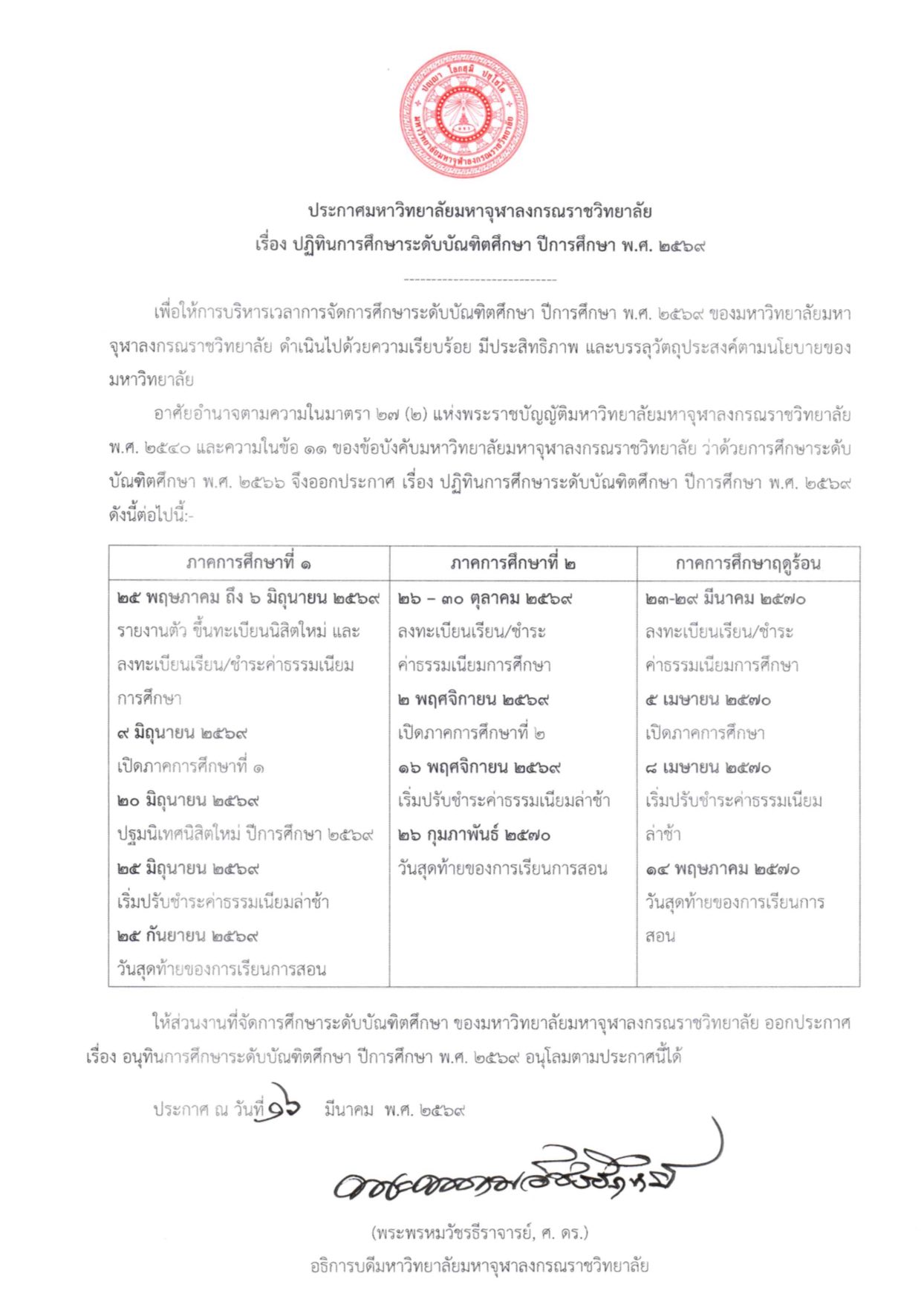 āđāļĢāļ·āđāļāļ āļāļāļīāļāļīāļāļāļēāļĢāļĻāļķāļāļĐāļēāļĢāļ°āļāļąāļāļāļąāļāļāļīāļāļĻāļķāļāļĐāļē āļāļĩāļāļēāļĢāļĻāļķāļāļĐāļē āļ.āļĻ. āđāđāđāđAnnouncement of Mahachulalongkornrajavidyalaya UniversityAcademic Calendar for Graduate Studies, Academic Year 2026