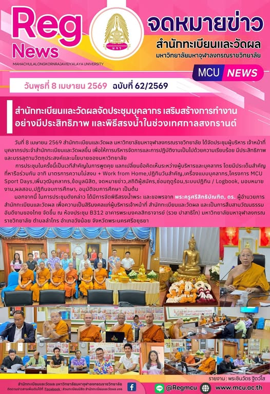📅 วันที่ 8 เมษายน 2569 สำนักทะเบียนและวัดผล มหาวิทยาลัยมหาจุฬาลงกรณราชวิทยาลัย ได้จัดประชุมผู้บริหาร เจ้าหน้าที่ และบุคลากรประจำสำนักทะเบียนและวัดผล เพื่อให้การบริหารจัดการและการปฏิบัติงานเป็นไปด้วยความเรียบร้อย มีประสิทธิภาพ และบรรลุตามวัตถุประสงค์และนโยบายของมหาวิทยาลัย 🎯
